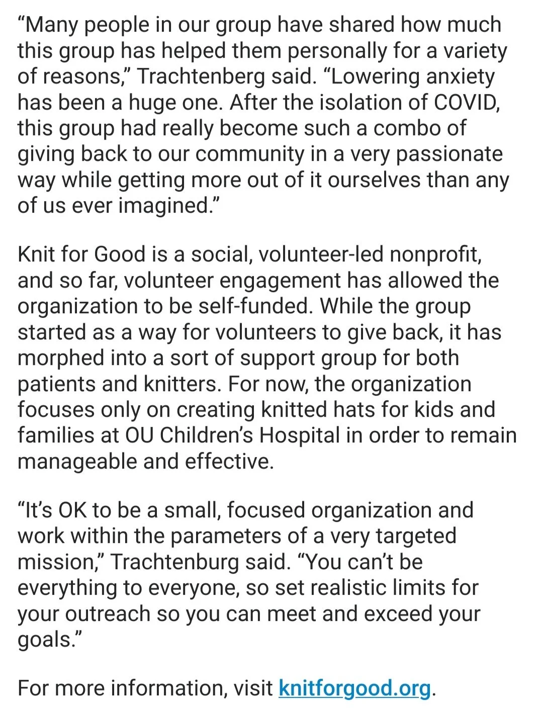 If you’d like to learn more about Knit For Good, please email KnitForGood@gmail.com.