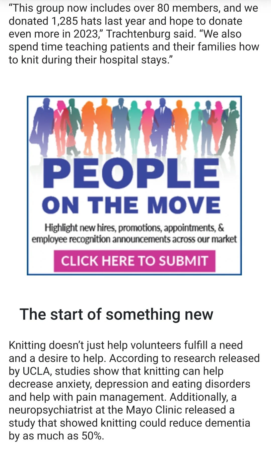 Knitting doesn’t just help volunteers fulfill a need and a desire to help. According to research released by UCLA, studies show that knitting can help decrease anxiety, depression and eating disorders and help with pain management. Additionally, a neuropsychiatrist at the Mayo Clinic released a study that showed knitting could reduce dementia by as much as 50%.