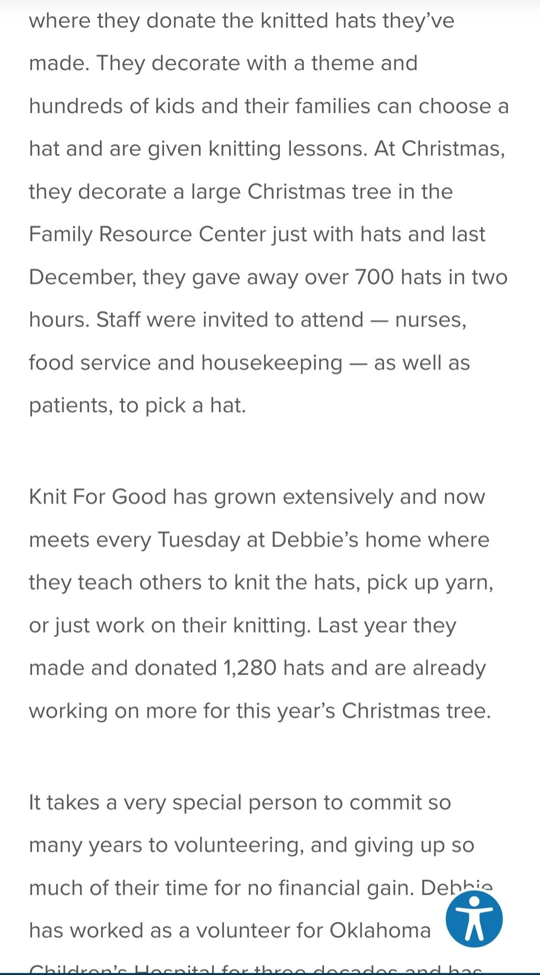 Knit For Good currently has 70 people knitting the hats and the group holds a Fall Festival and Spring Festival at Oklahoma Children’s Hospital, where they donate the knitted hats they’ve made. They decorate with a theme and hundreds of kids and their families can choose a hat and are given knitting lessons. At Christmas, they decorate a large Christmas tree in the Family Resource Center just with hats and last December, they gave away over 700 hats in two hours. Staff were invited to attend — nurses, food service and housekeeping — as well as patients, to pick a hat.