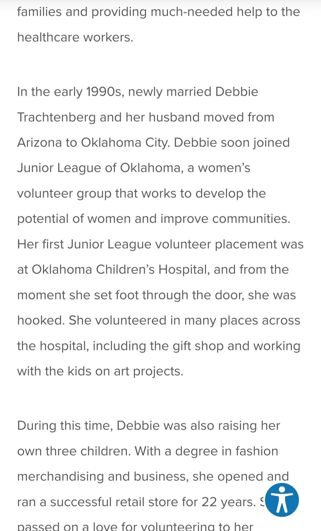 In the early 1990s, newly married Debbie Trachtenberg and her husband moved from Arizona to Oklahoma City. Debbie soon joined Junior League of Oklahoma, a women’s volunteer group that works to develop the potential of women and improve communities. Her first Junior League volunteer placement was at Oklahoma Children’s Hospital, and from the moment she set foot through the door, she was hooked. She volunteered in many places across the hospital, including the gift shop and working with the kids on art projects.