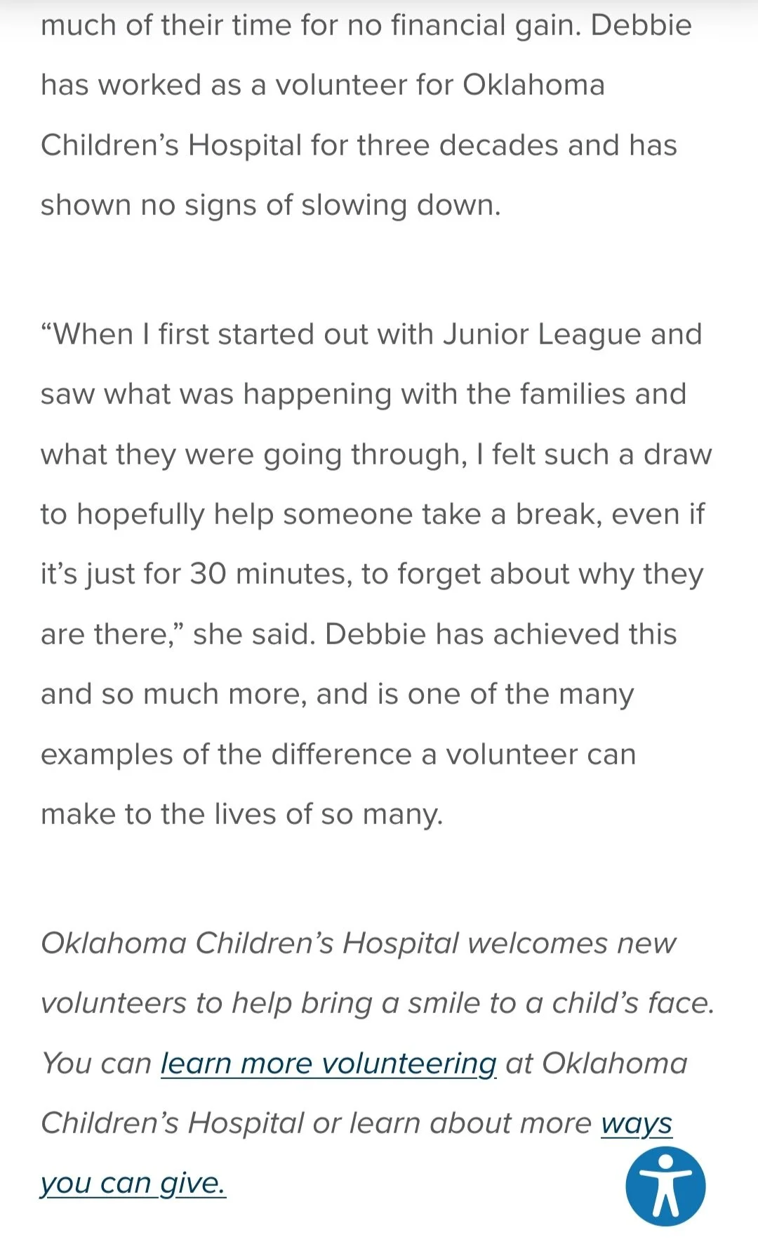 It takes a very special person to commit so many years to volunteering, and giving up so much of their time for no financial gain. Debbie has worked as a volunteer for Oklahoma Children’s Hospital for three decades and has shown no signs of slowing down.