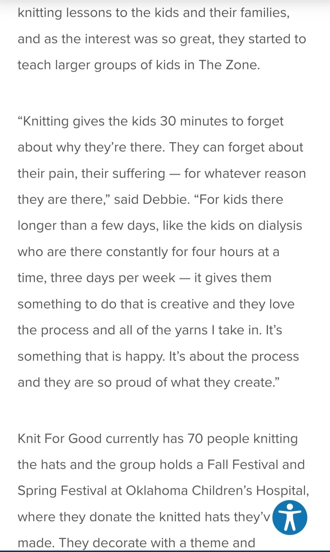 In 2021, Debbie and her husband took all of the research and information to team members at Oklahoma Children’s Hospital and were given approval to start a knitting program with the patients. Debbie and a few of her friends from Knit For Good started to give one on one knitting lessons to the kids and their families, and as the interest was so great, they started to teach larger groups of kids in The Zone.