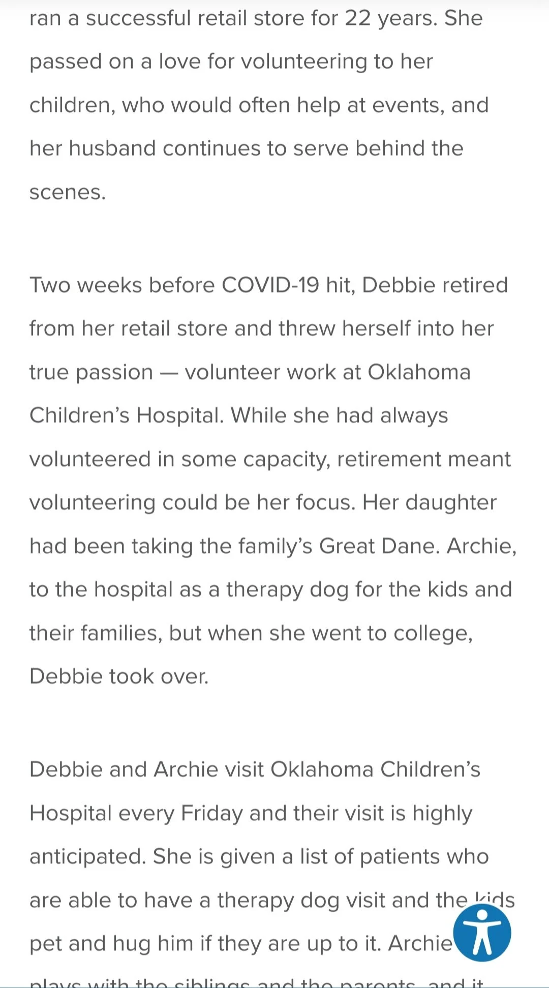 Two weeks before COVID-19 hit, Debbie retired from her retail store and threw herself into her true passion — volunteer work at Oklahoma Children’s Hospital. While she had always volunteered in some capacity, retirement meant volunteering could be her focus. Her daughter had been taking the family’s Great Dane. Archie, to the hospital as a therapy dog for the kids and their families, but when she went to college, Debbie took over.