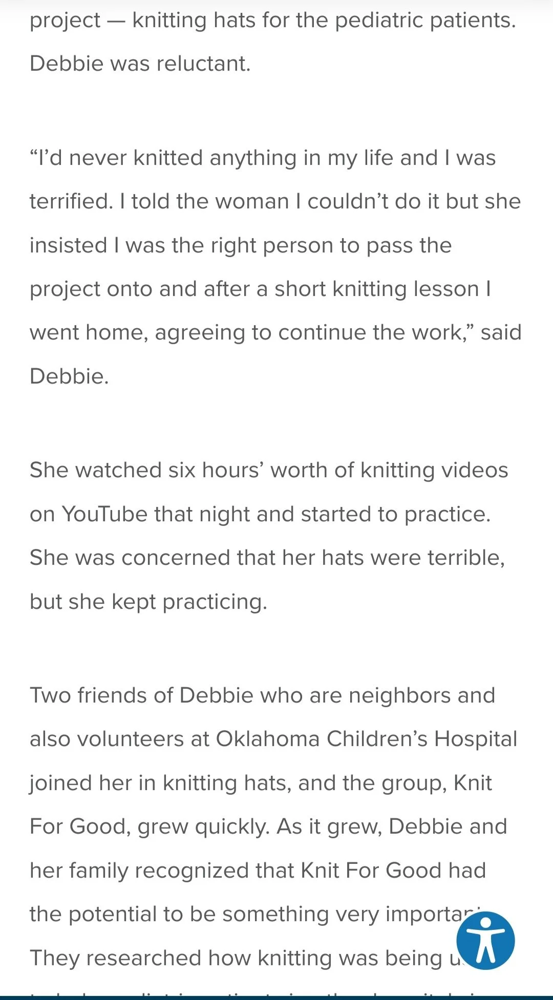 One day while taking Archie for his visits, Debbie started talking to a woman who was visiting a patient. The woman presented Debbie with a set of knitting needles and some yarn, and told her that she was passing on a new project — knitting hats for the pediatric patients. Debbie was reluctant.