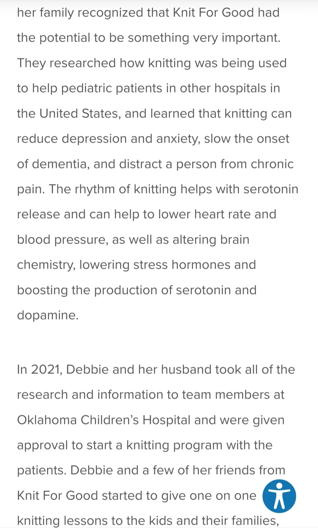 Two friends of Debbie who are neighbors and also volunteers at Oklahoma Children’s Hospital joined her in knitting hats, and the group, Knit For Good, grew quickly. As it grew, Debbie and her family recognized that Knit For Good had the potential to be something very important. They researched how knitting was being used to help pediatric patients in other hospitals in the United States, and learned that knitting can reduce depression and anxiety, slow the onset of dementia, and distract a person from chronic pain. The rhythm of knitting helps with serotonin release and can help to lower heart rate and blood pressure, as well as altering brain chemistry, lowering stress hormones and boosting the production of serotonin and dopamine.